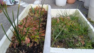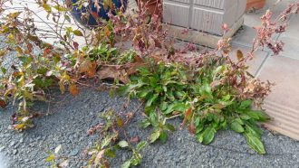 水仙の芽の傍らには夕化粧が葉を広げている。夕化粧の種があっちこっちにとんで入り込んだんだろう。水仙に影響がなければそのままにしておいてもいいけど、どうかな。夕化粧の指定席は玄関ポーチの舗装の隙間。