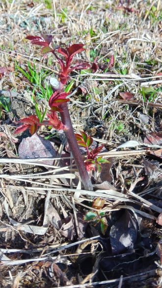 挿し木をしたバラの枝にも、葉芽が出て来た。これは地植え(地差し?)。土が乾いたらいけないと、冬の間も毎日水をあげていた。何とか根付いてくれたようだ。花は咲かせてくれるだろうか、今から楽しみ。