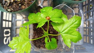 午後、陽が照ってきたので見回り。モミジバフウの苗木にテントウムシがとまっていた。日向ぼっこかな♪