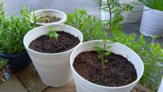 送りが終わってから、このモミジバフウと、実の生る山椒の苗木をポット鉢から本格的な鉢にお引越し作業。
